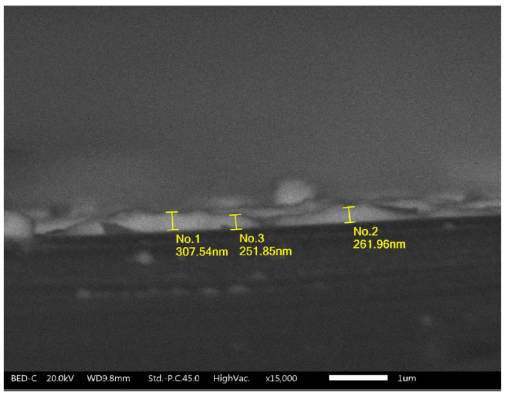 The crystallinity of perovskite thin films was studied by XRD with a Bruker X-ray diffractometer with CuKα radiation (1.5418 Å). The thickness of the perovskite thin films was determined by using a JEOL (JSM-IT300) scanning electron microscope (SEM). The transmission and absorbance spectra were obtained in a Thermo Scientific GENESYS 10S UV-Vis spectrophotometer.