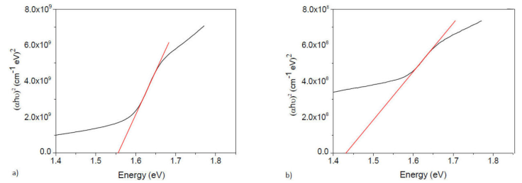 Figure 4 Absorbance versus Energy for a) CH3NH3Pb0.9Sn0.1I2.8Cl0.2 and b) CH3NH3Pb0.75Sn0.25I2.5Cl0.5.