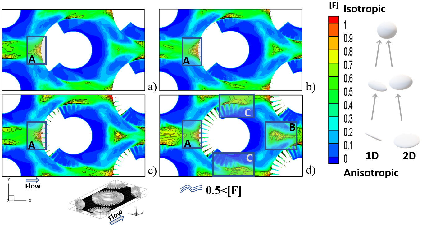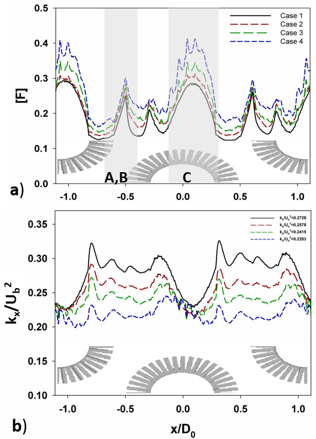 where A(y − z)Free Total are the free yz-area of every xplane. The important thing to highlight is the areas where the variables are the maximum. In the case of parameter [F], the maximum value was observed in front of the tubes A-square (Figs. 8 and 10) behind the tubes (B-square) and on the sides of the tubes, generated mainly by the separation of the boundary layers C-square (Figs. 8 and 10). Figure 10a) shows a third peak at the beginning of the last zone mentioned above. The small peaks in Fig. 10a) (in the C- squares) are the effect of fin segmentation. The streamwise mean maximum values for Case 4 are [F] ≈0.4, and for Case 1, [F] ≈ 0.28. However, locally, the value can reach close to 0.9 for all cases. See square A in front of the central tube in Fig. 8. For turbulence kinetic energy, the distribution was more uniform. The variable decreased around the tube center. The highest streamwise velocity was observed in this zone (Fig. 4). In this zone, the minimum values of the fluctuations of the principal components are found. However, an increase in the third component, A-square (Fig. 6), was observed for Cases 3 and 4. Figure 10b) shows the bulk mean Eq. (8) values for each case. A maximum decrease of 16% was found between Cases 1 and 4.