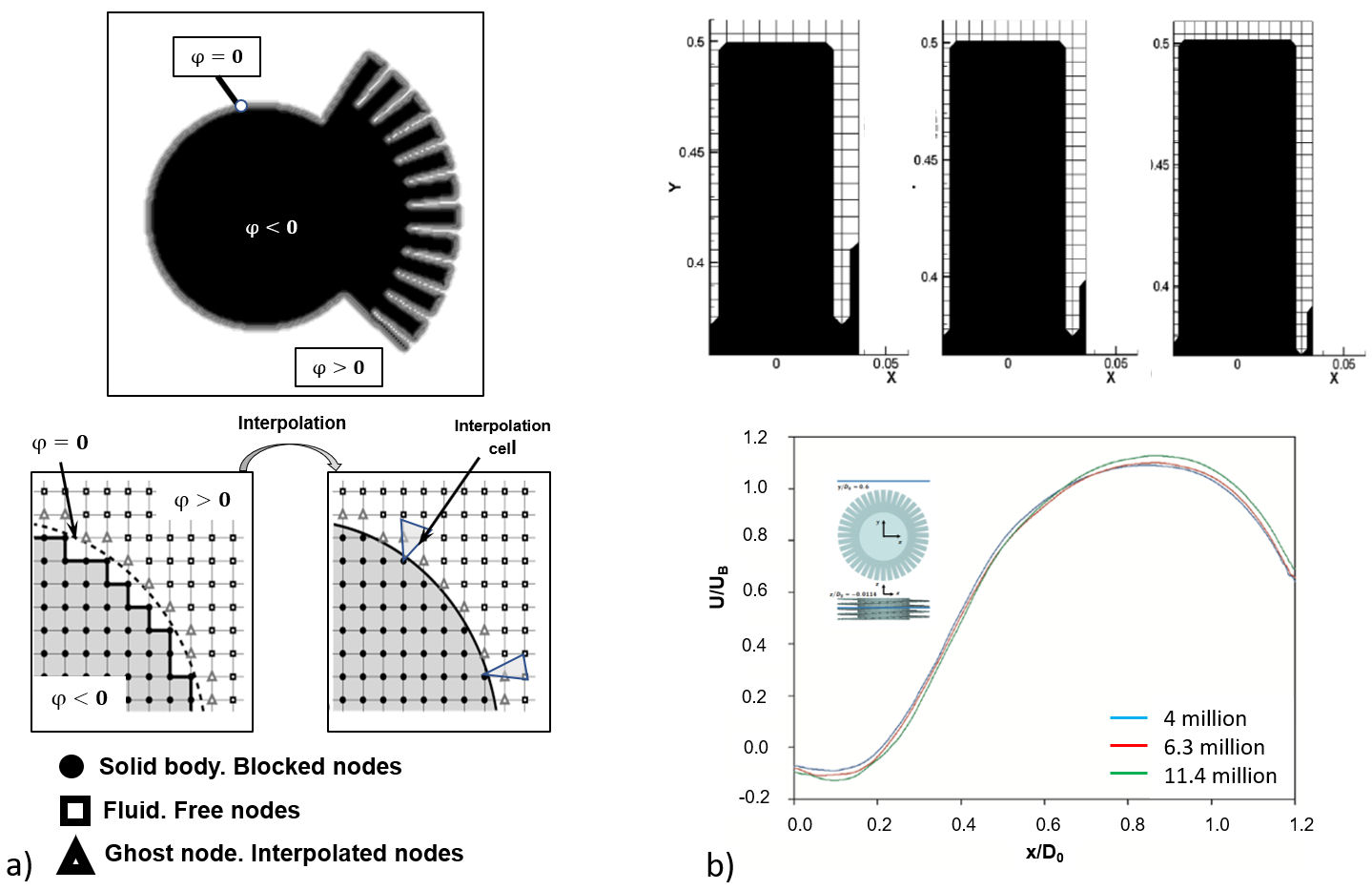 FIGURE 2 Immersed boundary conditions and grid independence. a) Immersed boundary conditions based in the use of a level set function ϕ. Interpolation of the solid body variable values avoids the stepping behavior. b) Fin representation in three different grid resolutions. Mean streamwise velocity comparison for three different grid resolutions.