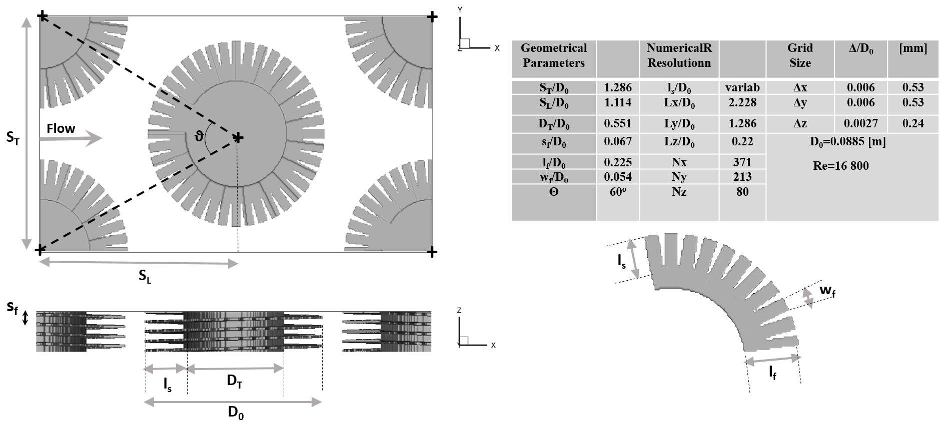 Helical segmented-fin or serrated-fin tubes are widely used in heat exchangers because the heat transfer surface decreases, and consequently, the weight of the thermal equipment is reduced. The heat transfer performance is not sacrificed because the geometry of finned tubes promotes turbulence, although the pressure drop also increases. In the open literature, experiments and numerical simulations have studied the thermal-hydraulic behavior of helical segmented-fin (serrated-fin) tubes. Most experiments present global studies of heat transfer and pressure drop on finned tube banks [15]. Some works compare the thermal performance of different serrated-fin geometries, as developed by Zhou et al. [1]. Other studies analyze the effect of segmented-fin (serratedfin) characteristics, such as fin pitch, fin height, fin density, and segmented fin height on heat transfer and pressure drop. For instance, heat transfer and pressure drop increase as fin height and fin density increase, as reported by Naess [2] and Ma et al. [3]. In contrast, the fin pitch has a reverse behavior because heat transfer and pressure drop decrease, as found in Naess [2] and Kiatpachai [4]. Keawkamrop et al. [5] found that segmented fin height significantly affects the Nusselt number. Some experiments report detailed information as visualizations [6, 7] and velocity measurements [8]. For example, Pis’mennyi [6,7] identified experimentally intense vortical structures in the front of the fins, which increased the transfer of momentum and energy. Papa [8] measured the velocity field and turbulence parameters in half of a finned tube.