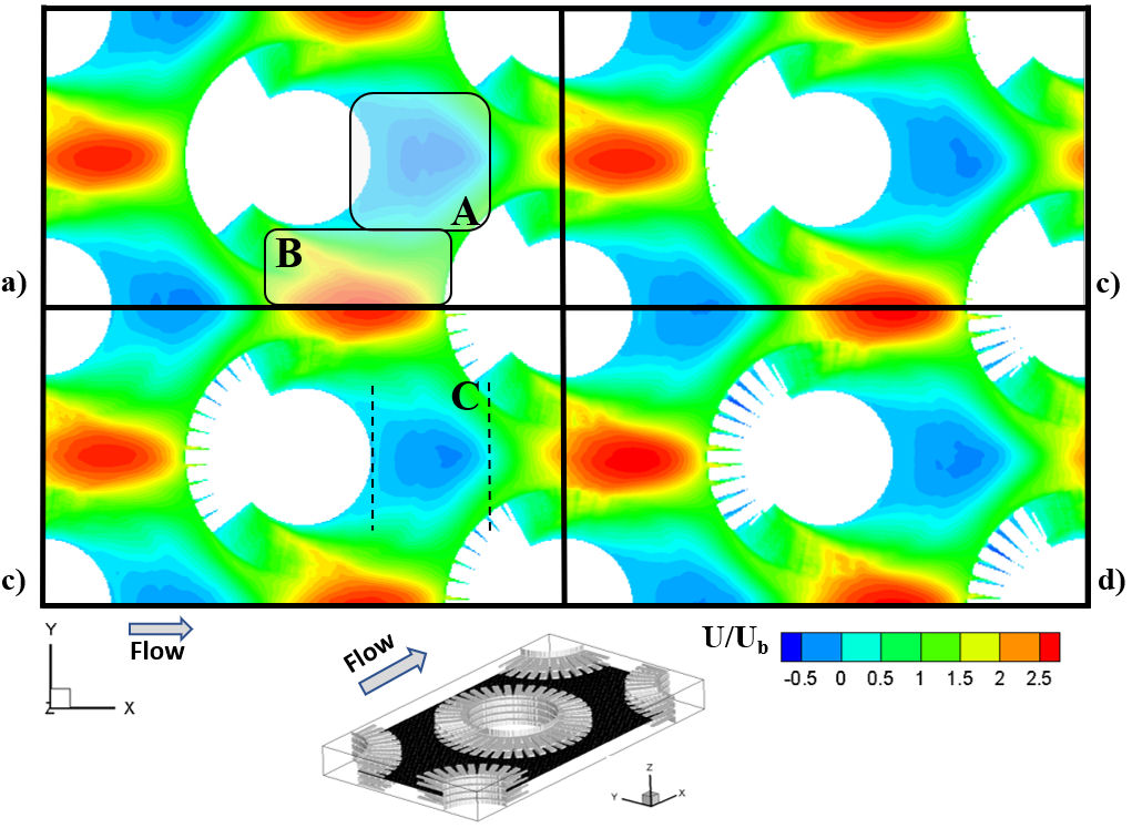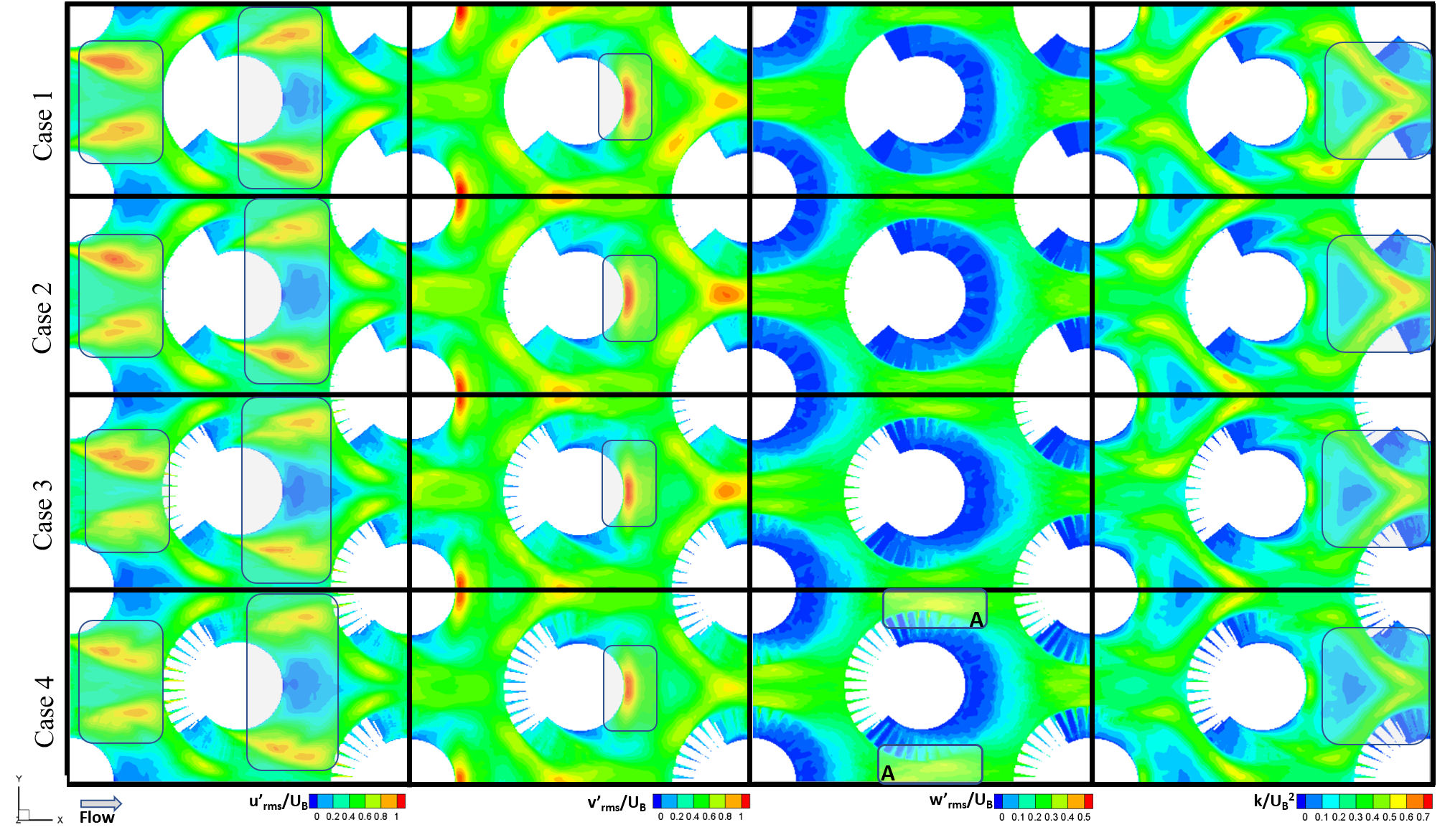 Figure 4 shows the mean streamwise velocity in a z-plan. The darker blue zones (negative velocity values) show recirculation zones. As seen in previous works [22], the mean velocity field shows a pair of symmetrical recirculations behind the tubes (dark blue zones, A-square) and high-velocity bands away from the tubes (red zones, B-square). However, several antisymmetric recirculations were observed in instantaneous fields [22]. Recirculation size (C-lines) and the minimal and maximal mean streamwise velocity values were similar for all cases studied. A comparable situation was observed for the other components. Small changes in velocity fields bring with them minimal changes in pressure drop. A great advantage in heat exchanger design is the marginal increase of < 2% in the pressure drop observed between Cases 1 and 4.
