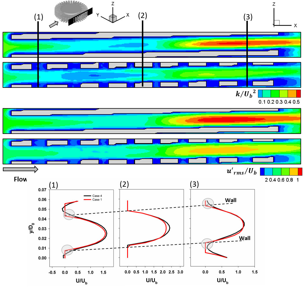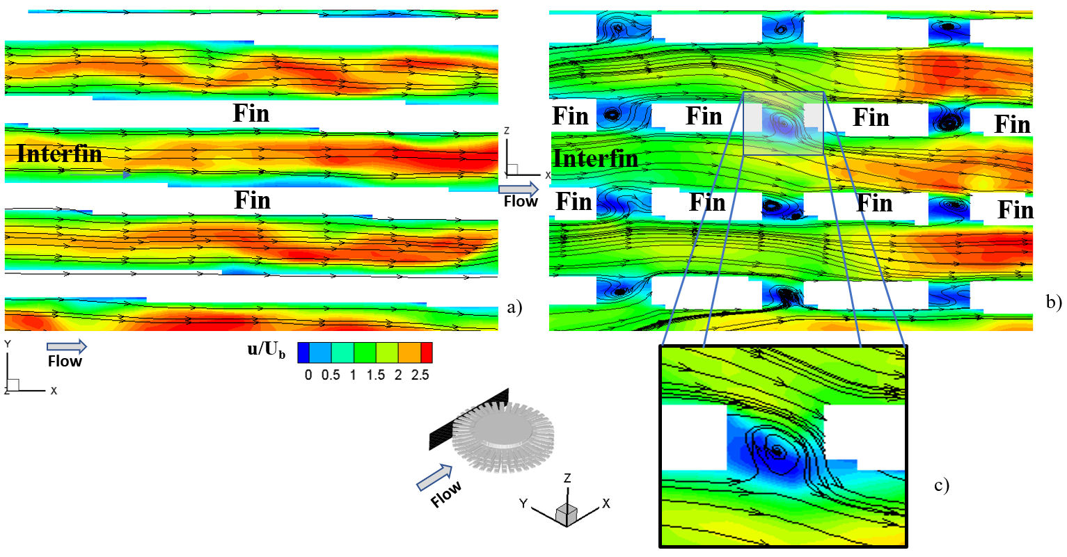 The main change in the flow for the different cases studied was found in the interfin zones. The interaction between these zones is shown from instantaneous velocity fields. Figure 5 shows the trajectory lines in the y-plane. The flow goes from one zone to another through the spaces made by the fin segmentation (Fig. 5c). The instantaneous and mean magnitude of the normal velocity component increases in this zone.