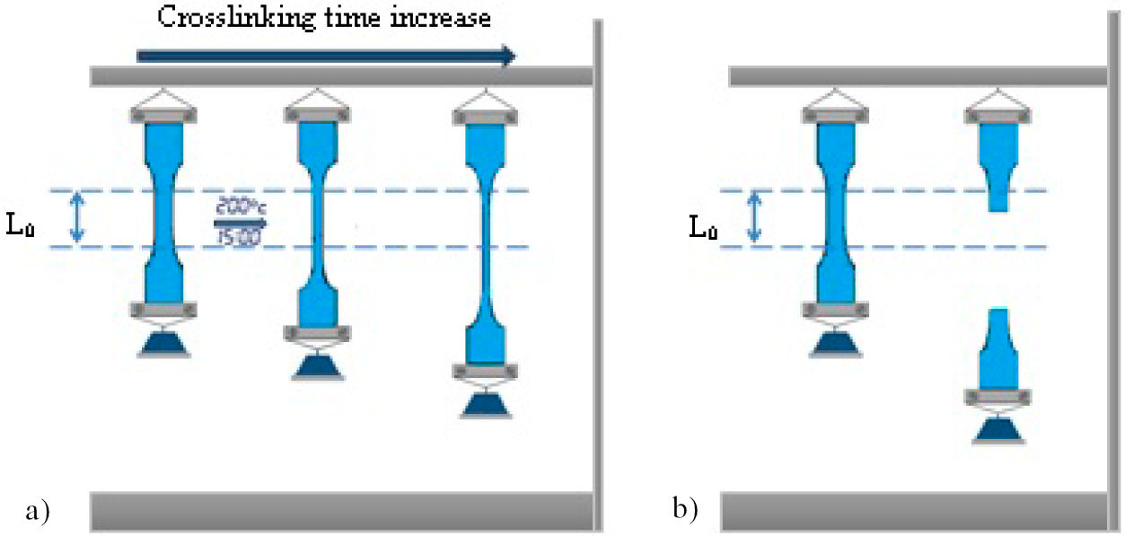 FIGURE 1 Schematic representation of the Hot-Set-Test measurement. a) Cross-linked sample, b) non cross-linked sample.