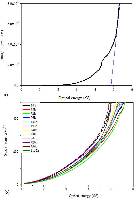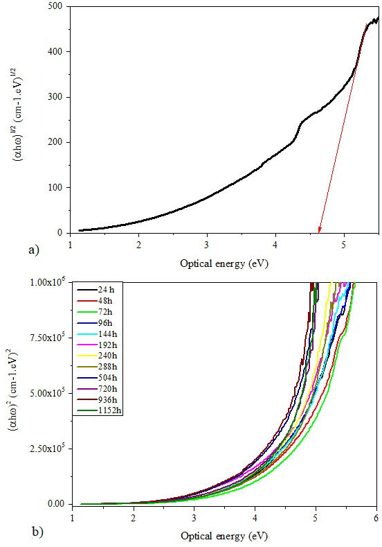 The energy gap can be extrapolated by determining the intercept of the linear portion of the curves to the beginning of the absorption edge on the energy axis. at (αω)2 = 0 and (αω) 1/2 = 0 [43]. The direct and indirect E opt values of all samples are ploted in Fig. 12 according to the aging time. It is clear that both optical band gaps (direct and indirect) behave in the same way. They increase until the weathering aging time reaches 144 hours and decrease afterwards. The increase of the optical band gaps at the beginning of aging indicates that the insulating character of the material is enhanced which may have a significant effects on the dielectric properties of the insulation.