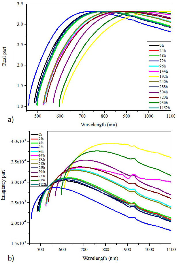 where ℜ is the reflectance, A is the absorbance, T is the transmittance, λ is the incident light wavelength and λ is the absorption coefficient. Figures 14a) and 14b) display the evolution of the real and imaginary parts of optical dielectric constant with wavelength for the virgin and aged Si-g-LDPE samples.