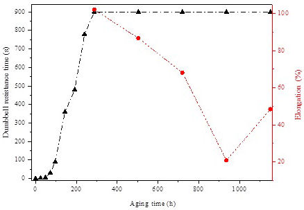 Figure 3 shows the evolution of sample’s elongation under high temperature (200C) and time to failure (break) according to aging time. As can be seen, the evolution of crosslinking density presents two phases: In the first phase (from 0 to 288 h), the sample did not resist to the tensile stress under applied high temperature and the breakdown of the sample occurred after a critical time tc. In this phase the cross-linking process is evaluated by the evolution of this critical time.