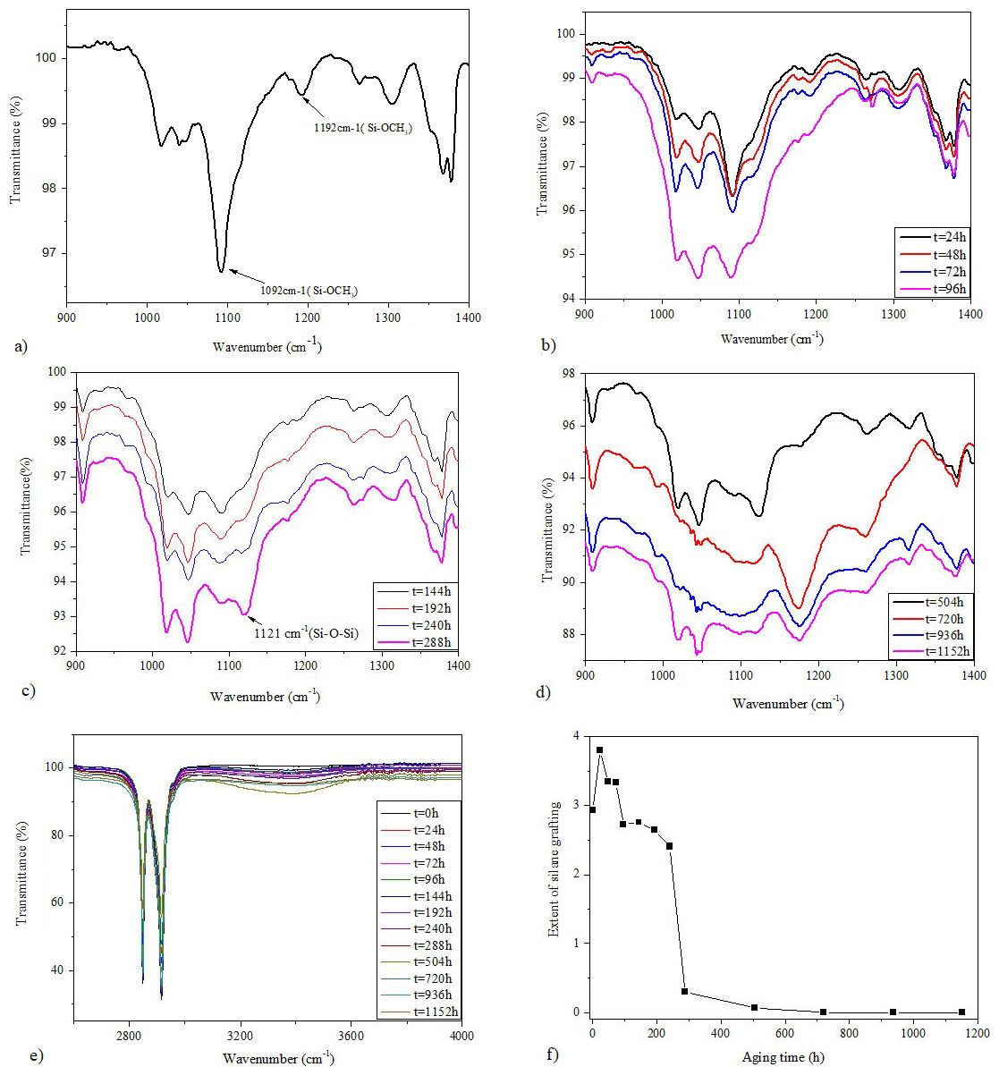 FIGURE 5 FTIR spectra of Si-g-LDPE. a) Spectra from 1400 cm−1 to 900 cm−1 for fresh sample. b), c), and d) Spectra from 1400 cm−1 to 900 cm−1 for aged samples at different aging periods. e) Spectra from 4000 cm−1 to 2700 cm−1 for all samples. f) Variation of silane grafting extent as a function of weathering aging.