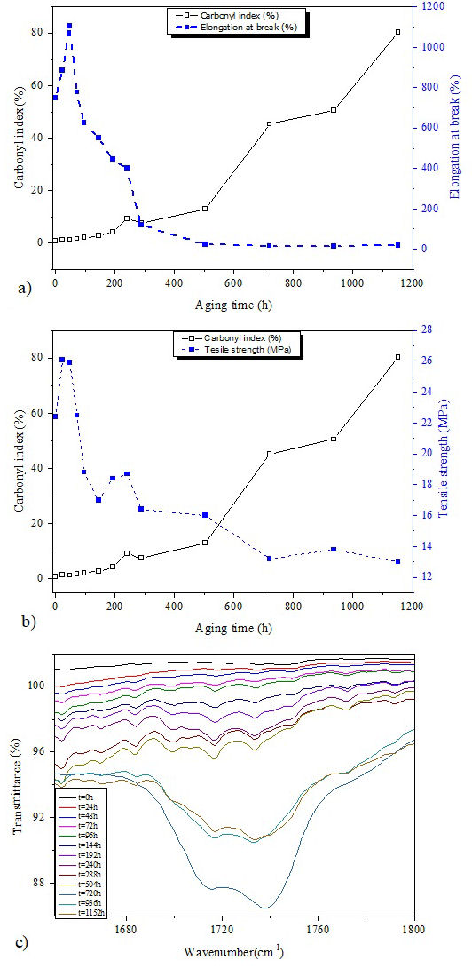 It is clear from Figs. 6a) and 6b) that both mechanical properties and carbonyl index present a similar trend of changes. The rise of carbonyl index is accompanied by a decline of mechanical properties. This behavior indicates the existence of a certain degree of cross-correlation between macroscopic and microscopic scales and evidences the existence of same degradation mechanism.