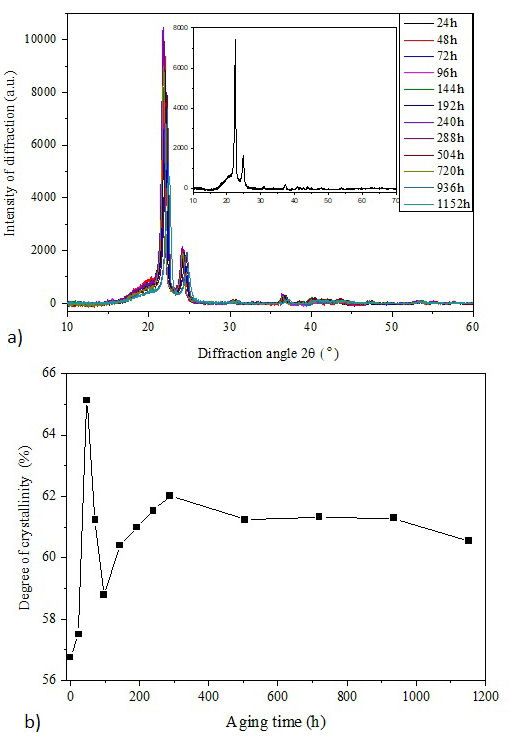 Figure 7a) displays X-ray spectra of aged samples at different periods ranged from 24 h to 1152 h. The inset represents the diffractogram of the fresh sample as a reference. It is observed that all spectra have two main diffraction peaks appearing at 22.5 and at 24.8 which correspond to (110) and (200) planes, respectively [37], associated to an amorphous boss. It seems from this figure that the angle (2θ) of two peaks was slightly changed with weathering aging.