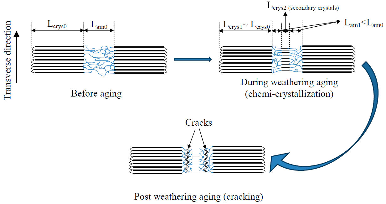 This scheme illustrates that during photo-oxidation process, the semi-crystalline polymer preserves the thickness of its primary crystalline region, however, the amorphous domain decreases by the re-crystallization of newly formed crystalline domain creating secondary crystallites and were strictly limited within the amorphous region. Consequently, the amorphous part shrinks by the growth of the crystalline part that gains extra organization. With the development of secondary crystallites the inter-lamellar space is reduced, causing the embrittlement of Si-g-LDPE, therefore promoting the formation of cracks and the occurrence of sharp transition from ductile behavior to brittle one.