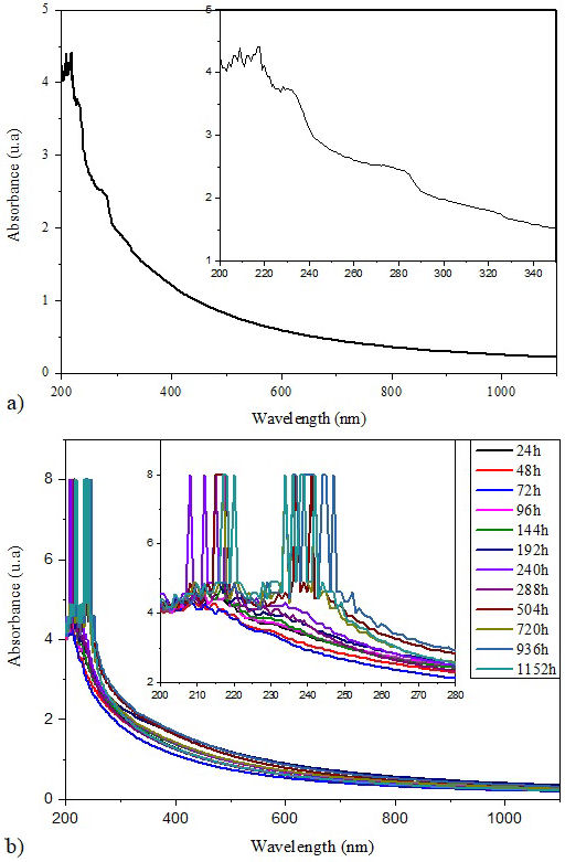 The second broad absorption band becomes more pronounced with increase of aging time [inset of Fig. 9b)]. The sharp peaks have been observed only for samples aged to time longer than 240 h. The move of the absorption edge in the direction of the longer wavelength and the appearance of sharply absorption peacks are mostly due to the development of radicals, unsaturated bands, oxidized components and conjugated bands resulting from the chains scission process [42].