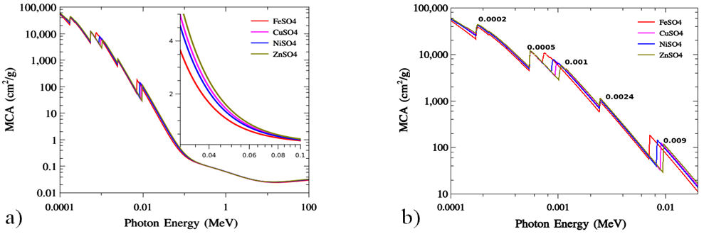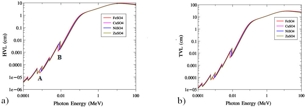 Figure 9 represents the MCA calculated for the (0.0001 - 100 MeV) photon energy range. The right figure is the zoom part for the (0.0001 - 0.01 MeV) low energy. It should be mentioned that the lower part has 5 peaks at energies 0.0002, 0.0005, 0.001, 0.0024, and 0.009 MeV. The compound FeSO4 precedes all at 0.001 MeV photon energy. For the energy range from about 0.04 up to 0.1 MeV one can find ZnSO4 can have the highest value while the FeSO4 has the lower values. Based on the MCA calculations, we generate the HVL and The TVL values according to Table I. Results are summarized in Fig. 10. Results show that for about 600 keV the HVL has a value less than (1 cm). As the photon energy increases up to 100 MeV the HVL can have (10 cm). In many areas such as A and B the FeSO4 can reach good values than other compounds.