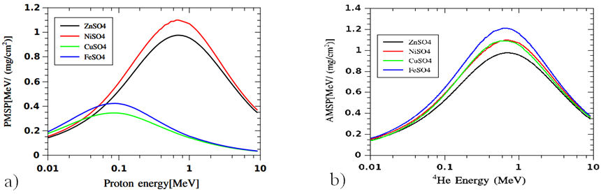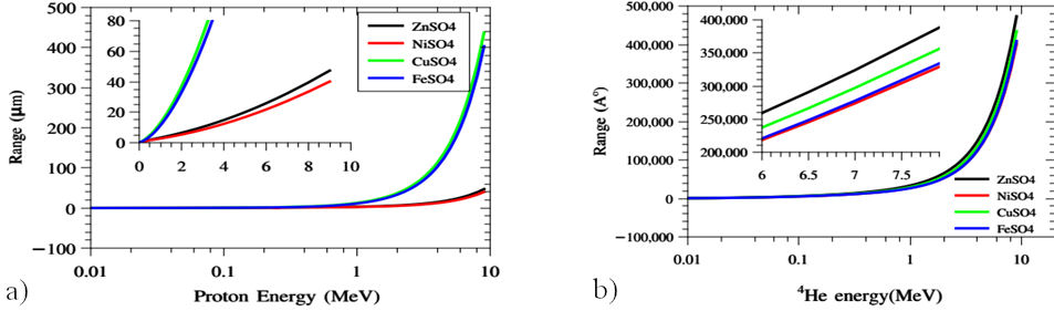 The proton and alpha 0.01-10 MeV ranges were calculated using the SRIM 2008.04 code Fig. 13. For proton, it is found that Cu and Fe have higher values than Zn and Ni sulphate but for the alpha particle range, Zn and Cu sulphate have the highest values than the other one.