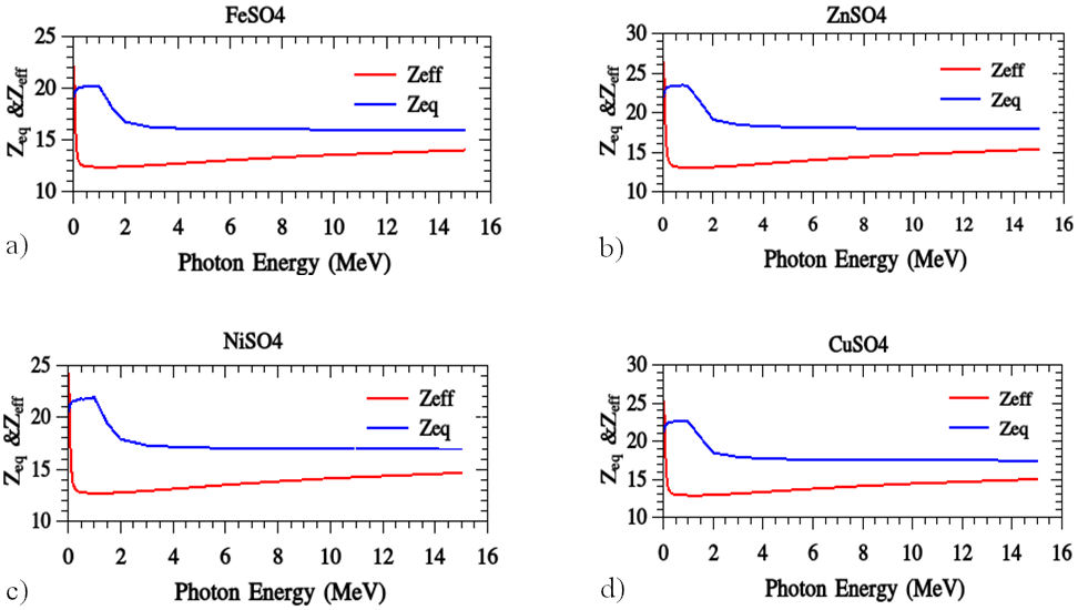 Figure 14 shows a plot of Zeff and Zeq for the current samples in the range 0-15 MeV. Thus, the sample FeSO4 possesses the lowest Zeff and Zeq because Fe has the lowest atomic weight 55.845 than other samples.