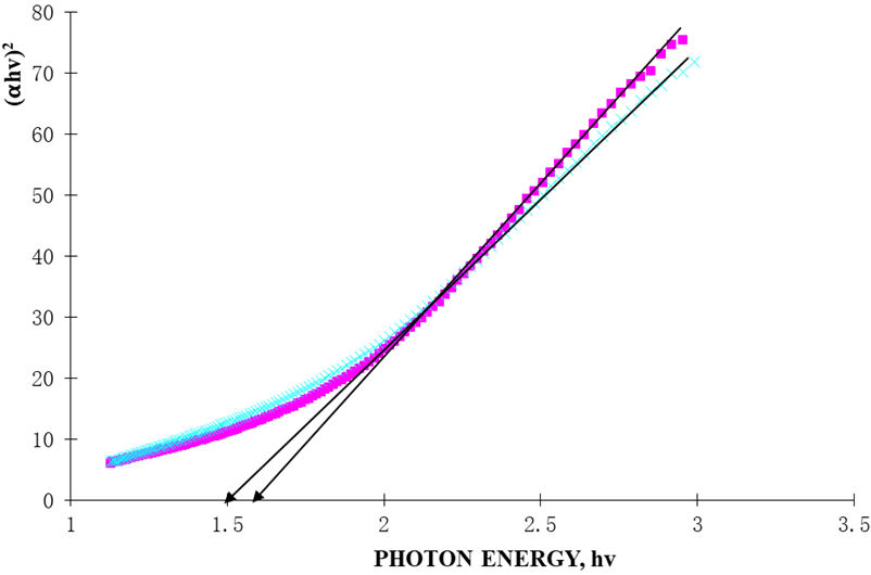 where K is a constant, E g is the energy band gap and n is a constant equal to 2 for direct band gap. Figure 7, shows the variation of (αhν)2 versus hν for Ag/AgO films. The graph gave the direct band gap values, obtained by extrapolating the linear line on hv axis as 1.5 and 1.6 eV for the films.