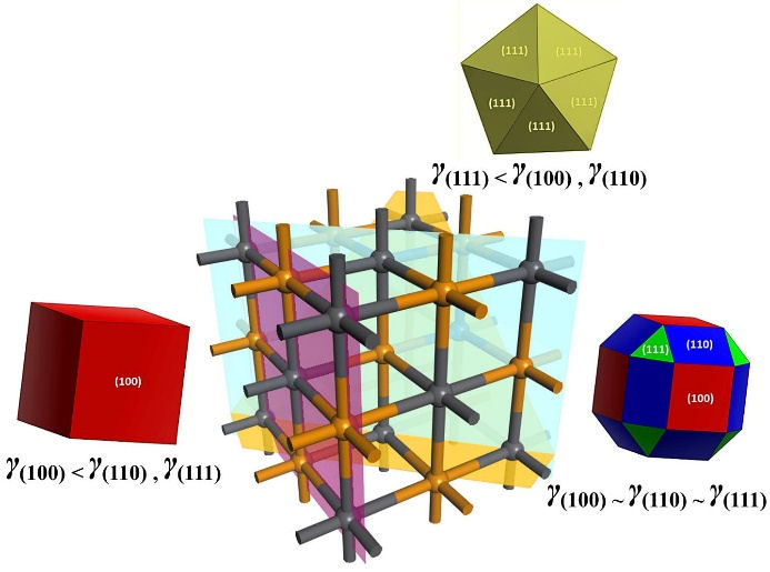According to the calculations performed within DFT, these morphologies are due to comparable surface energies γ, with Wulff shapes exhibiting the (100) and (111) faces. Furthermore, the modified decahedron Wulff shape results from the stabilization of the (111) faces, while the faceted Wulff shape is obtained because the (100), (110), and (111) faces are energetically competitive. While the Wulff construction does not predict the shape of particles based on their size, it does provide insight into the reasons they exhibit the morphologies observed experimentally.