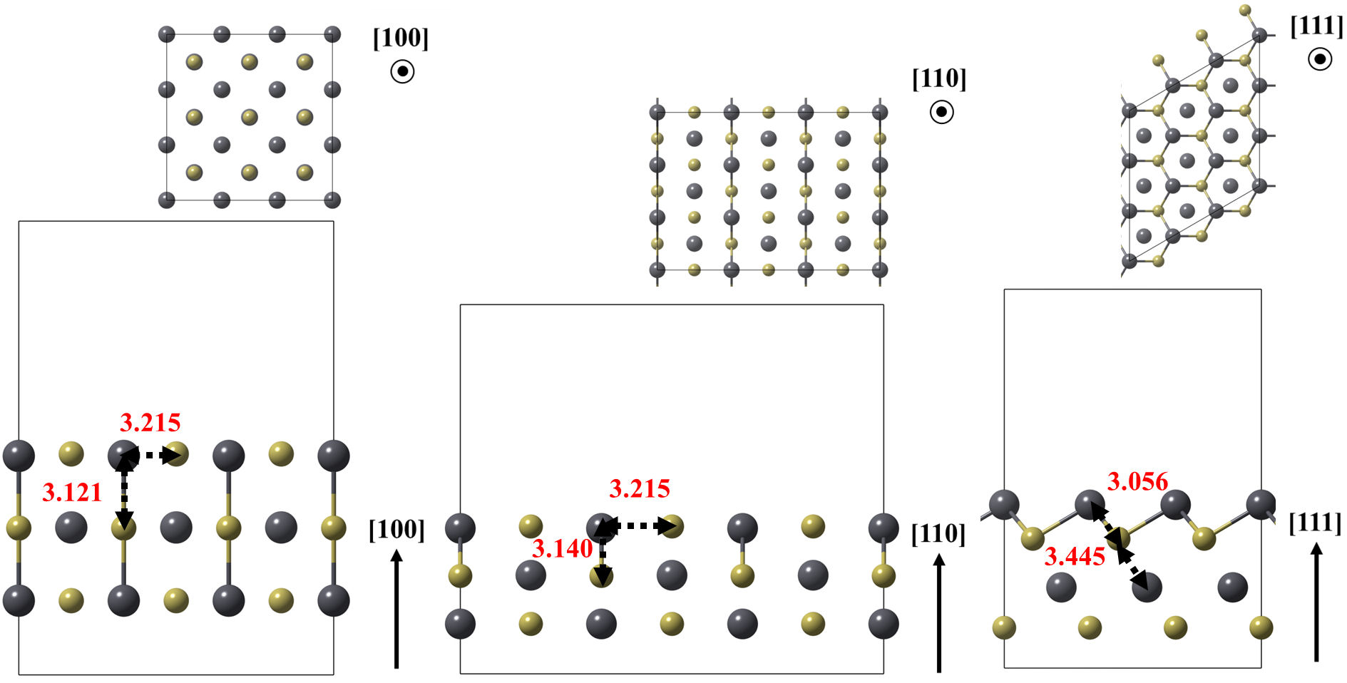 FIGURE 3 Optimized models of the (100), (110) and (111) Pb surfaces of the PbTe. Relevant bonds are annotated in angstrom units. Crystallographic directions are indicated as well.