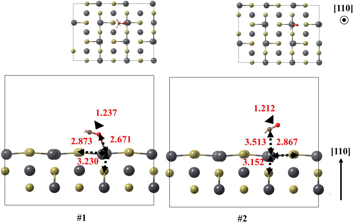 In case of (110) surface, the ground state and the following low-lying structure are obtained with 0.288 eV of energy difference. Once again, the ground state structure is obtained with the (CH2O) attached to the surface by oxygen, whereas the other is state by carbon. In these case, the shortest molecule-surface bond lengths are reduced down to 2.671 and 2.867 Å respectively. In this case, the adsorption energy is −0.917 eV.
