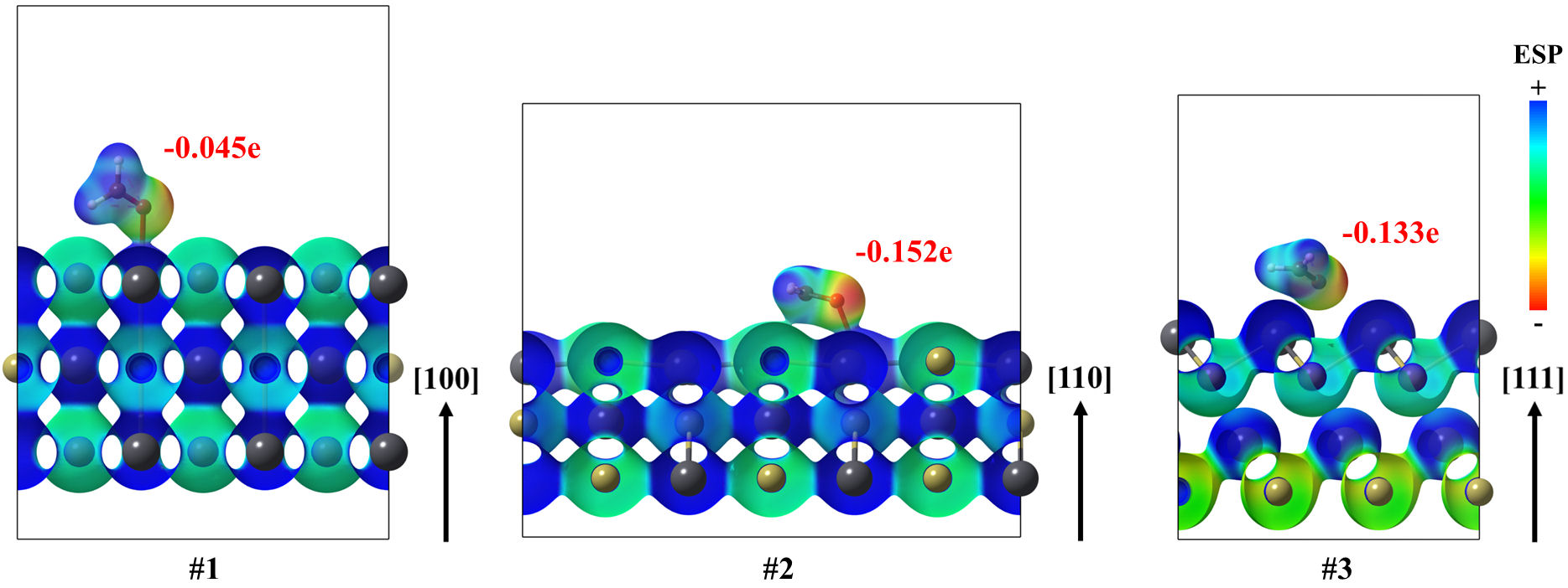 FIGURE 8 Electrostatic potential mapped on isosurfaces, with 0.02 a.u. of electron density, for (100), (110) and (111) Pb surfaces of the PbTe interacting with formaldehyde in their ground states. Also, Bader charges on formaldehyde are annotated as well.