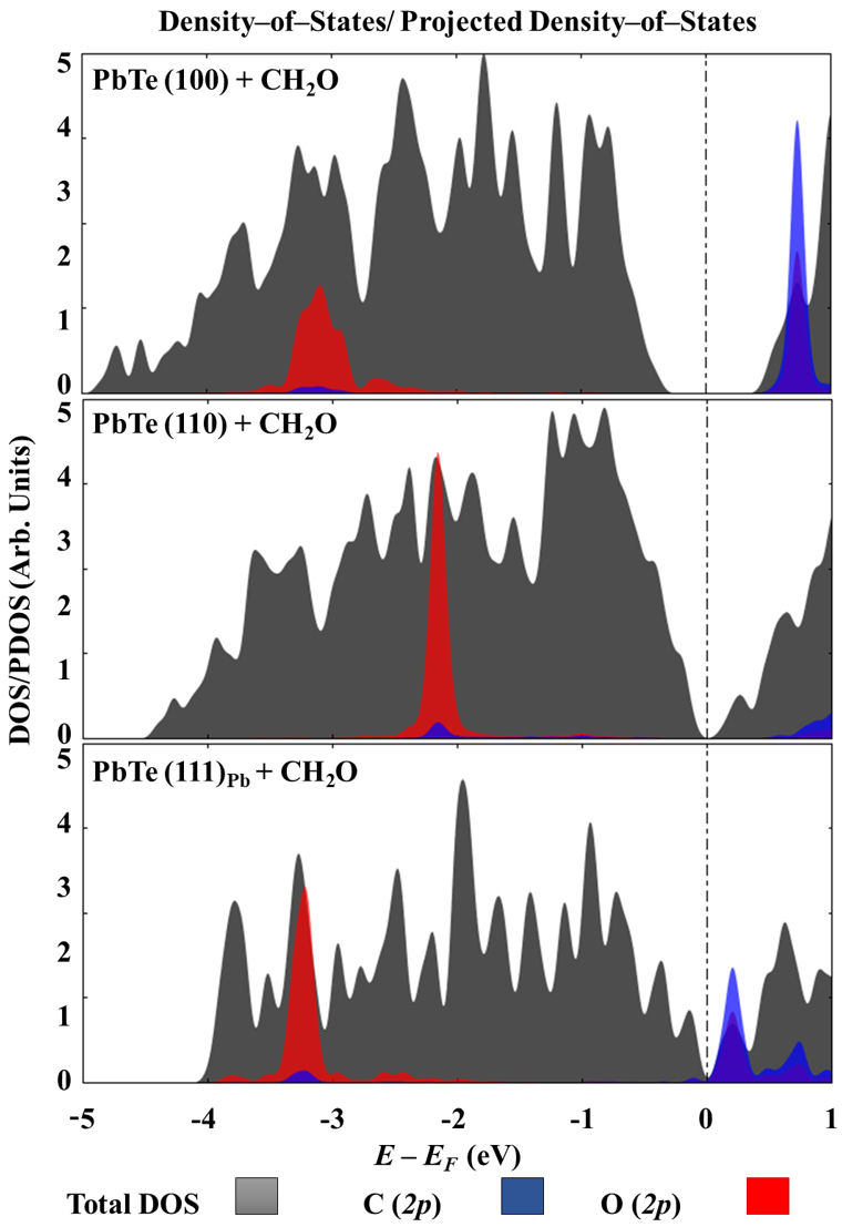 The interaction with formaldehyde was modeled by allowing the surface modifier to interact with the PbTe plate models. Mostly, the interaction occurred between oxygen and lead atoms. The highest molecule-surface adsorption energy occurred with the (100) surface, in a range from −0.917 to −0.630 eV. Following this, there is a comparable adsorption energy between (100) and (111)Pb surfaces, with maximum values of −0.361 and −0.388 eV, respectively. To analyze the interactions of CH2O with the surfaces under study.