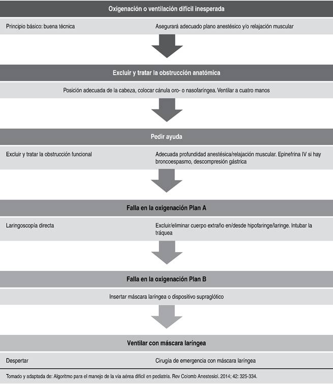 Para establecer una vía aérea definitiva se prefiere realizar la secuencia rápida de intubación que incluye el uso de sedación, analgesia y relajación muscular.21 En general, esta secuencia de intubación es segura y eficaz, sobre todo en situaciones de emergencia (Tabla 2). En algunas ocasiones, la secuencia de intubación rápida falla, y es ahí donde desempeñan un papel importante los métodos alternativos como la visualización por video, la máscara laríngea y cánula supraglótica “i-gel”, la cual es un método de rescate.22 En la Figura 1 se muestra el algoritmo de manejo para la intubación orotraqueal (IOT) difícil e inesperada en niños.23