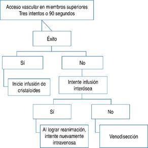 Parte del manejo del paciente pediátrico traumatizado incluye la monitorización continua, administración de oxígeno suplementario y la valoración constante de los signos vitales, así como la oximetría.4 Del mismo modo, se deben obtener dos vías de acceso venoso periférico, preferiblemente en extremidades superiores; sin embargo, el acceso femoral puede usarse como un acceso venoso central. En caso de tener dificultad para el acceso venoso, dado el compromiso hemodinámico del paciente en los primeros cinco minutos, se puede utilizar una vía intraósea; sin embargo, cuando se realiza, se debe limitar la administración de cristaloides a razón de 25 mL/min. En presencia de fracturas de extremidades esta vía está contraindicada. 42,43 En estos casos se debe plantear el uso del ultrasonido como guía de acceso intravenoso, lo cual facilita el acceso venoso, sea periférico o central, reduciendo la tasa de complicaciones (Figura 2).44