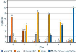 A partir del día 1 hubo cambio hacia la mejoría, particularmente en la pregunta: “¿qué tan enfermo está su hijo hoy?” con respecto al valor basal (Figura 2). Para el día 5 de tratamiento, la mayoría de los pacientes (n = 32) reportaron que tenían mejoría clínica.