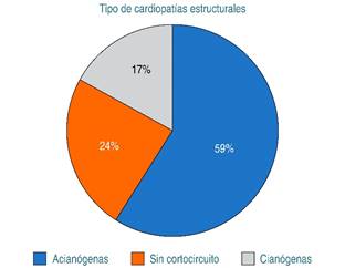 Las cardiopatías congénitas (n = 634) se clasificaron en tres grupos: cianógenas (17%), acianógenas (59%) y sin cortocircuito (24%). Las cardiopatías acianógenas incluyeron: comunicación interventricular (CIV), comunicación interauricular (CIA), PCA o la combinación de dos o más defectos. En el caso de cardiopatías cianógenas, las más frecuentes fueron tetralogía de Fallot, conexión anómala de venas pulmonares (CAVP), atresia pulmonar, anomalía de Ebstein, canal atrioventricular (AV) y atresia tricúspide. Mientras que las más frecuentes del grupo de cardiopatía congénita sin cortocircuito fueron: coartación aórtica, estenosis pulmonar, estenosis e insuficiencia aórtica. Cabe señalar que usualmente las cardiopatías sin cortocircuito se clasifican como cardiopatías acianógenas.