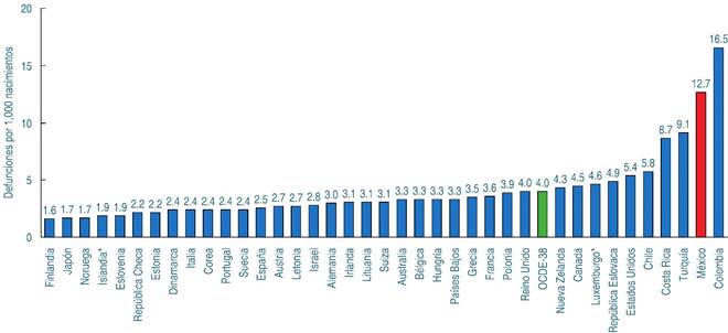 Como se comentó para el año 2021, la TMI en México superó en más de tres veces el promedio de los países de la OCDE. Siendo mayor la disparidad al comparar la TMI mexicana con la de Finlandia, Japón y Noruega. En este contexto, el riesgo de fallecimiento en México para los niños y niñas es casi siete veces mayor. Según datos de la OCDE, México se sitúa en el penúltimo lugar, solo por arriba de Colombia (Figura 1).