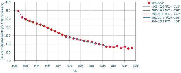 La tendencia de la mortalidad infantil desde 1990 hasta 2021 se analizó utilizando el modelo de regresión segmentada JoinPoint versión 4.5.0.1.14 Este modelo, basado en un modelo log-lineal, identifica puntos en el tiempo donde la dirección o la magnitud de la tendencia cambia significativamente, con el fin de probar si una línea multisegmentada es estadísticamente mejor para describir la evolución temporal de un conjunto de datos, en comparación a una línea recta menos segmentada.15,16 El modelo JoinPoint identifica los puntos en el tiempo donde se producen cambios significativos en las tendencias, estimando el porcentaje de cambio anual (APC, por su sigla en inglés: annual percentage of change) para cada segmento de la regresión lineal, así como sus intervalos de confianza al 95% (IC95%) y su nivel de significancia estadística.17