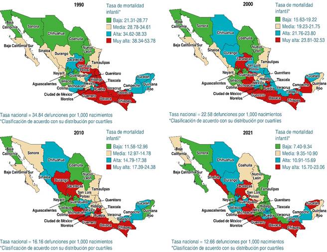 Al observar la distribución geográfica de la mortalidad infantil por entidad federativa, pero agrupadas por cuartiles en función de su magnitud, mostró que Chiapas, Guerrero y Oaxaca fueron las únicas entidades del país que se clasificaron en muy alta mortalidad infantil en las últimas tres décadas. Por su parte, Michoacán y Zacatecas se categorizaron con alta mortalidad en 1990, pero en las siguientes tres décadas escalaron a entidades de muy alta mortalidad. Yucatán se clasificó de alta mortalidad entre 1990 a 2010, pero para el 2021 escaló a la categoría de muy alta mortalidad. Sinaloa tuvo una mortalidad infantil media en 1990 y 2000, alta en 2010 y muy alta en 2021. Finalmente, destaca el caso de Veracruz, que transitó por las cuatro categorías: de mortalidad muy alta en 1990, alta en 2000, media en 2010 y baja en 2021 (Figura 3).