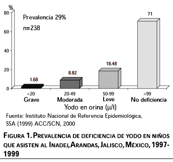 Por su magnitud son de particular importancia la deficiencia de hierro, considerada como el problema de origen nutricio de mayor prevalencia en México,1 y la deficiencia dietética crónica de yodo (DDCY) de la cual existe muy poca información en el país,2-4 y cuya distribución geográfica se ubicaría principalmente en las regiones más áridas y montañosas. El estudio de Noguera (1994)3 hace referencia a otro hecho en el estado de Hidalgo y demuestra una prevalencia de 6% de bocio clínico y, de acuerdo con la excreción urinaria de yodo, 32.8% de la población estudiada se encuentra en riesgo moderado o grave de deficiencia de yodo. La mayor inquietud que estas dos patologías, con alta prevalencia en México, producen, derivan de que cada una en forma aislada, combinadas o asociadas con desnutrición crónica afectan el crecimiento físico, el desarrollo psicomotor y el rendimiento escolar del niño dejando secuelas probablemente irreversibles.5