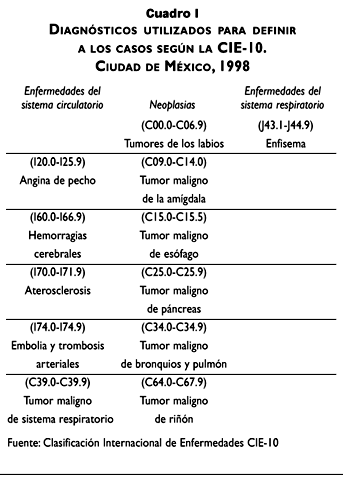Los padecimientos estudiados fueron enfermedades del sistema circulatorio (I00-I99), enfermedades del sistema respiratorio (J00-J99) y neoplasias (C00-D48), el resto de los diagnósticos constituyeron el grupo de comparación o referencia (cuadro I).