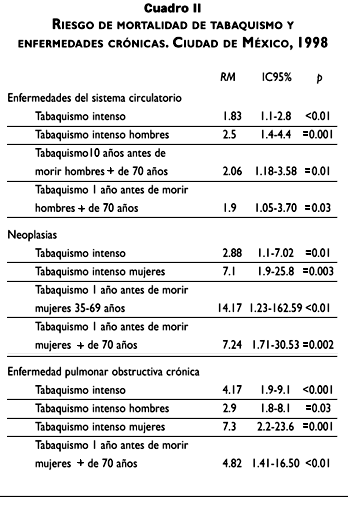Cuando se estratificó por edad y sexo, este mismo modelo en los hombres mostró que las personas con la variable tabaquismo intenso positiva tuvieron una posibilidad 1.5 veces mayor de fallecer por enfermedades del SC, y el riesgo atribuible de esta variable para las enfermedades del SR en la población general fue de 60%. (RM=2.5; p=0.001; IC 95% = 1.4-4.4).