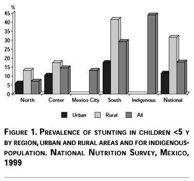 So far national averages have been presented. However, stunting is distributed heterogeneously among population sub-groups. Figure 1 shows the prevalence of stunting for each region by urban and rural areas and in indigenous children. Prevalence in rural areas (31.6%) is about 3 times higher than that found in urban areas (11.6%) and the prevalence in the north (the wealthiest region) is much lower than in the south (the poorest region). The combination of regions and urban/rural areas results in the largest differences. For example, while the prevalence in urban areas of the north is about 6%, the prevalence in the rural south is over 40%, almost 7 times higher.8