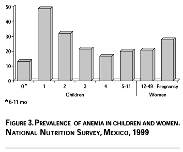 The main exception to the consistency between dietary intake and deficiency, as assessed by biochemical indicators, is iron. The actual prevalence of iron deficiency in women and children is much higher than what would be expected from the risk as assessed by iron dietary intake. This apparent discrepancy between dietary intake and the blood concentration of the mineral can be explained in part by the bioavailability of different types of iron consumed in the population and by other dietary factors that inhibit the absorption of iron. A high proportion of the population in Mexico consume small amounts of meat, the source of heme iron which is most bioavailable, but consume large amounts of corn and beans which contain important quantities of phytic acid and other inhibitors of iron absorption. Consumption of milk, which also inhibits the absorption of iron when consumed in large quantities, is also relatively high33 For example, children < 5 years consume on average 215 g of milk and milk products, 75 g of tortillas and only 20 g of meat per day; children 5-11 years 180 g of milk, 160 g of tortillas, 45 g of beans and only 32 g of meat per day; and women 126 g of milk, 200 g of tortillas, 40 g of beans and only 40 g of meat per day.33 An analysis of the NNS-1999, published elsewhere,34 estimated iron bioavailability using dietary data in the sub-sample of children < 5 years of age (n=919). We found that the dietary intake of iron was relatively high (6.2±mg); however, only 0.3 mg were heme iron and the intake of phytic acid was very high (670 mg). The resulting bioavailable iron was only 0.25 mg (3.9% of all iron). This amount did not satisfy the mean physiologic requirements for this age group (0.54 and 0.87 mg for 1-3 and 4-6 year old children, respectively).35