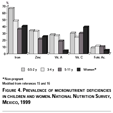 The high proportion of women and children with dietary inadequacies related to Vitamin A, Vitamin C, folate, zinc, and iron intake are in general consistent with the deficiencies found in these same micronutrients using biochemical indicators. This affirms the direct link between inadequate dietary intake and the high prevalence of micronutrient deficiencies in México, despite the evidence of underreporting dietary intake.
