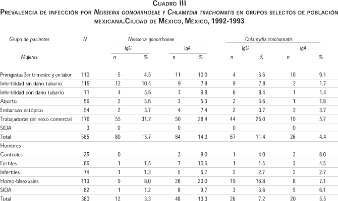RESULTADOS: En mujeres la prevalencia para NG fue IgG 13.7% e IgA 14.3%, y para CT fue IgG 11.4% e IgA 4.4%. En hombres, NG 3.3% y 13.3%, respectivamente, y para CT 7.2% y 5.5%, respectivamente. En TSC se encontró NG en 31.2 % y 28.4%, respectivamente, y para CT 25.0% y 5.7%, respectivamente. En mujeres con infertilidad por daño tubario, NG 5.6% y 9.8%, respectivamente, y CT 8.4% y 1.4%, respectivamente. En 110 primigestas jóvenes, NG 4.5% y 10.0%, respectivamente, y CT 3.6% y 9.1%, respectivamente.
