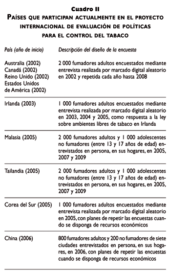 El proyecto ITC comenzó en 2002 con el establecimiento de cohortes de representación nacional de aproximadamente 2 000 fumadores adultos en Australia, Canadá, Reino Unido y Estados Unidos de América. En esta encuesta, la cohorte original del ITC se ha expandido desde entonces para incluir a fumadores de Irlanda, Malasia, Tailandia, Corea del Sur y China (cuadro II). El proyecto se centra en los fumadores porque ellos son el objetivo principal de la mayoría de las políticas de control del tabaco.