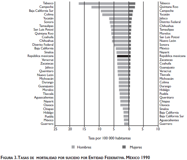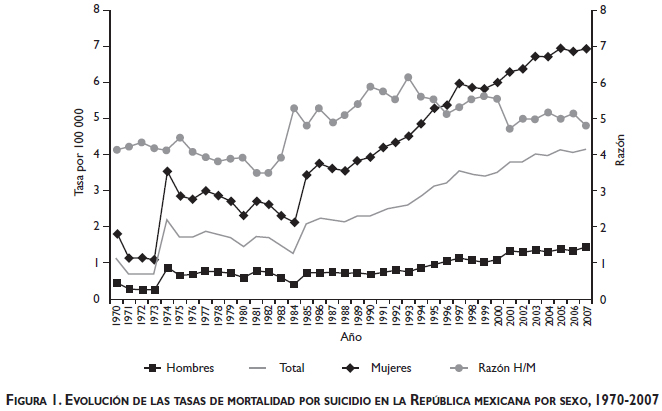 En un trabajo previo, publicado en 1996 y ya algo desactualizado sobre la epidemiología del suicidio en México, que abarcaba los años de 1970 a 1994, se afirmaba que: "En 1970 hubo 554 defunciones por suicidio en toda la República mexicana, para ambos sexos, y 2603 en 1994. Durante este periodo la tasa de suicidios en ambos sexos pasó de 1.13 por 100000 habitantes en 1970 a 2.89 por 100000 habitantes en 1994, un aumento de 156%."1 ¿Qué ha pasado desde entonces? El suicidio se ha instalado como parte del perfil epidemiológico moderno del país. En 2007, último año con estadísticas vitales disponibles al momento de escribir este trabajo, se dieron en México 4 388 muertes por suicidio en toda la República, con una tasa de mortalidad por suicidio de 4.12 por cada cien mil habitantes. En comparación con la tasa de suicido de 1970, se observa ahora para este largo período un crecimiento del 275% de ese año a la actualidad. Otras fuentes internacionales dan cuenta del acelerado proceso que ha seguido la mortalidad por suicidio en México. Por ejemplo, en un estudio de tendencias entre 47 países,2 Levi y colaboradores muestran que mientras la mortalidad por suicidio en los períodos entre 1980 y 1984 y entre 1995 y 1999 tuvo un comportamiento descendente en Japón, Canadá, Estados Unidos y varios países de Europa, se observaron incrementos de 90.3% para la población masculina mexicana (sólo superado por 248.1% en la república de Mauricio) y 25% para la femenina (con valores mayores de Lituania, España y Cuba).
