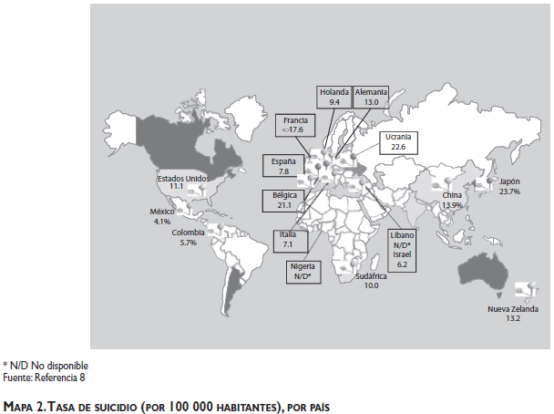 Por primera vez contamos con datos comparables a escala internacional de la conducta suicida.8 Hemos graficado estos datos junto a la mortalidad por suicidio de estos mismos países. Es claro que aún cuando estos datos no sugieren una relación directa entre las tasas actuales de suicidio consumado y las prevalencias de intento de suicidio, lo fundamental de estos resultados es que si bien México tiene una mortalidad relativamente baja en la comparación internacional,17 su prevalencia de intentos de suicido es mucho más elevada, con una posición intermedia entre los países estudiados (mapas 1 y 2).