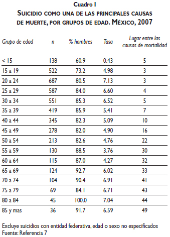 El suicidio, que en 1970 era un problema importante especialmente en la población de mayor edad, ha cambiado también en México siguiendo una tendencia internacional. Actualmente el suicidio se incrementa muy rápidamente en el grupo de 15 a 29 años, y se constituye ya en una de las primeras causas de muerte en este grupo de edad. Para los varones jóvenes, la mortalidad por esta causa en el grupo de 14 a 19 años representa el 10.64% del total de las muertes por suicidio. El 15.40% de ese mismo total se da en el grupo de 20 a 24 años y el 13.73% en el grupo de 25 a 29 años. En las mujeres, en el mismo orden, los porcentajes son 18.11, 17.34 y 12.16%. En estos tres grupos de edad, el suicidio corresponde respectivamente a las causas de muerte 3, 3 y 4 para los hombres y a las número 2, 2 y 6 para las mujeres. El cuadro I presenta de una manera condensada el número de muertes por suicidio, tasa y lugar en orden de importancia para varios grupos de edad en ambos sexos, en 2007. Como se ve, el suicidio es una de las cinco principales causas de muerte hasta los 34 años de edad, y la tercera entre los 15 y 24 años. Hasta los 44 años está entre las 10 primeras, disminuyendo en importancia a partir de estos grupos de edad (aun cuando sus tasas son de las más elevadas según se describió anteriormente).
