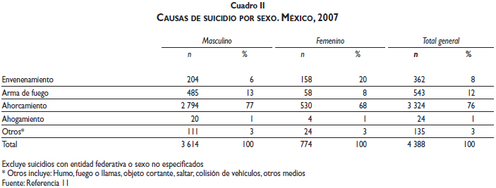 Los 4 388 suicidios que se observaron en el 2007 se distribuyeron por causas y sexo (cuadro II). En ambos sexos, la enorme mayoría de los suicidios se cometió por ahorcamiento (76%). Para las mujeres, la segunda causa fue por envenenamiento, mientras que para los hombres fue por uso de arma de fuego.