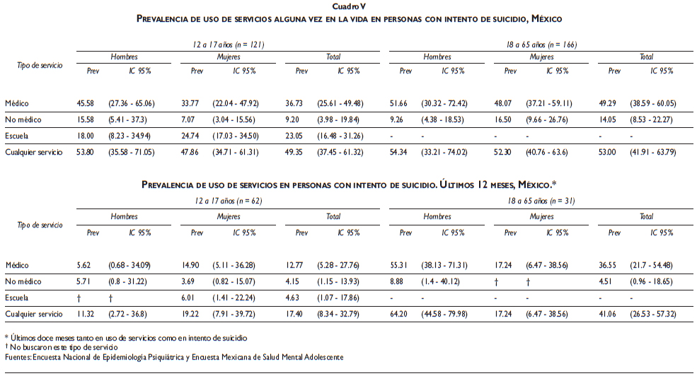 Los intentos de suicidio tienen consecuencias sobre el uso de los servicios de salud mental y los servicios médicos en general. En las dos encuestas psiquiátricas vemos que alrededor de la mitad de las personas con un intento de suicidio consultaron con los servicios para el tratamiento de problemas emocionales y de uso de alcohol y drogas (cuadro V). Los varones reportaron porcentajes un poco mayores de uso, especialmente en la población adolescente. Los servicios médicos son los más reportados, pero los adolescentes hacen también un uso importante de los servicios de atención especializada en las escuelas. Esta prevalencia de uso de servicios disminuye en forma notable para la prevalencia reciente de intentos de suicidio y el uso reciente de servicios (últimos 12 meses). Aquí, sólo 17% de la población adolescente y 41% de la población adulta (especialmente varones adultos) buscaron tratamiento. Dado el número tan pequeño de personas en estas circunstancias, estas estimaciones se deben de tomar con cautela.