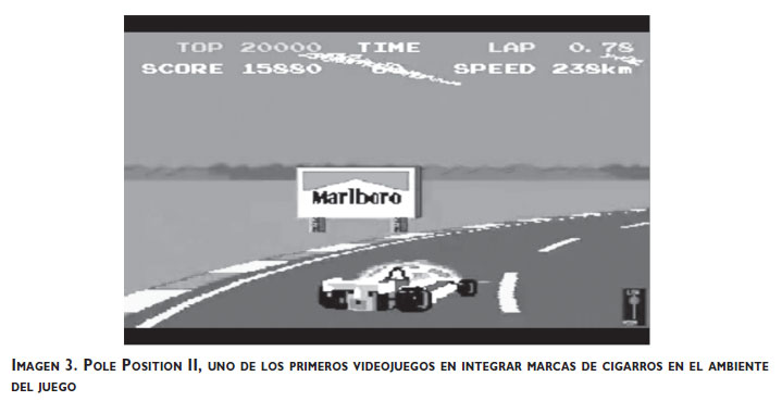 La IT reconoció el potencial de los videojuegos como herramienta publicitaria desde los años ochenta. La presencia de marcas de cigarros en los videojuegos se remonta a etapas tan tempranas como 1983, cuando Namco sacó al mercado "Pole Position II", un juego de carreras de automóviles que tenía espectaculares de Marlboro (imagen 3). Diversas marcas de cigarros fueron anunciadas directamente en videojuegos de aventuras (L&M en "Sunny Shine: on the funny side of life", 1990) y carreras de automóviles (Marlboro y John Player Special en Hang 198X, Marlboro en Out Run 1986, Monaco GP 1989, Chase HQ 1988, entre otros).22 La comercialización de estos videojuegos hacia la población infantil causó controversia, por lo que la IT se deslindó de ellos argumentando que las marcas habían sido utilizadas sin su consentimiento.