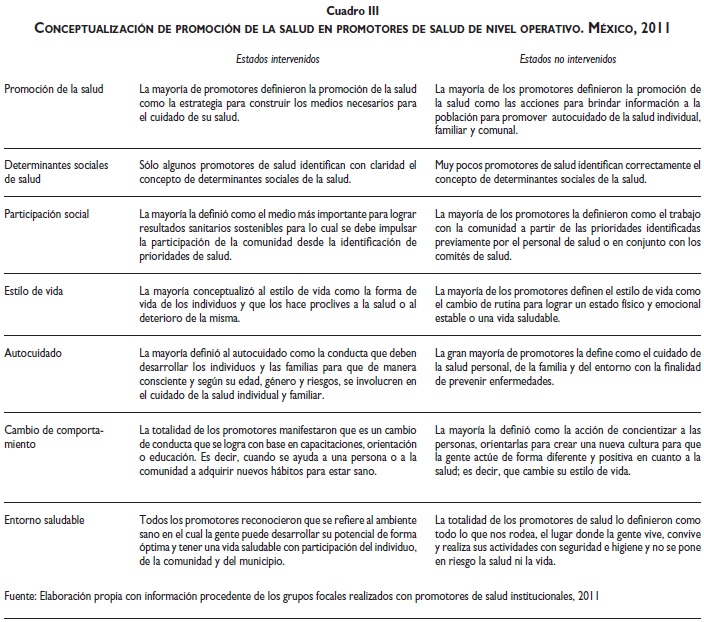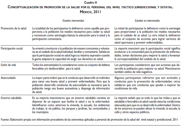 La totalidad del personal de los estados intervenidos conceptualizó la PS como "la estrategia que proporciona a la población los medios necesarios para el cuidado de su salud". En los estados no intervenidos se observó el manejo de este concepto en la mitad de entrevistados, la otra mitad concibió la PS como medidas orientadas a la prevención de enfermedades. El personal de los estados intervenidos señaló que el personal directivo de alto nivel tiene tendencia a concebir la prevención y promoción de la salud como conceptos similares.