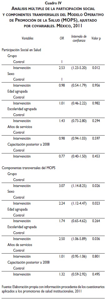 La regresión logística para las variables "participación social en salud" y "componentes transversales del MOPS" luego de ajustar por sexo, edad, escolaridad, años de servicio y capacitación en PS posterior a 2008, mostró que con una p 0.05 los promotores que recibieron capacitación por el INSP en 2007-2008 tienen 2.5 veces mejor conceptualización de la participación social en salud frente a los promotores que no recibieron capacitación por el INSP. Para la variable dependiente "conocimientos en los componentes transversales del MOPS", se encontró que los promotores que recibieron capacitación por el INSP en 2007-2008 tuvieron 3.1 veces mejor conceptualización de los componentes transversales del MOPS con respecto a los promotores que no recibieron capacitación en PS por el INSP (cuadro IV).