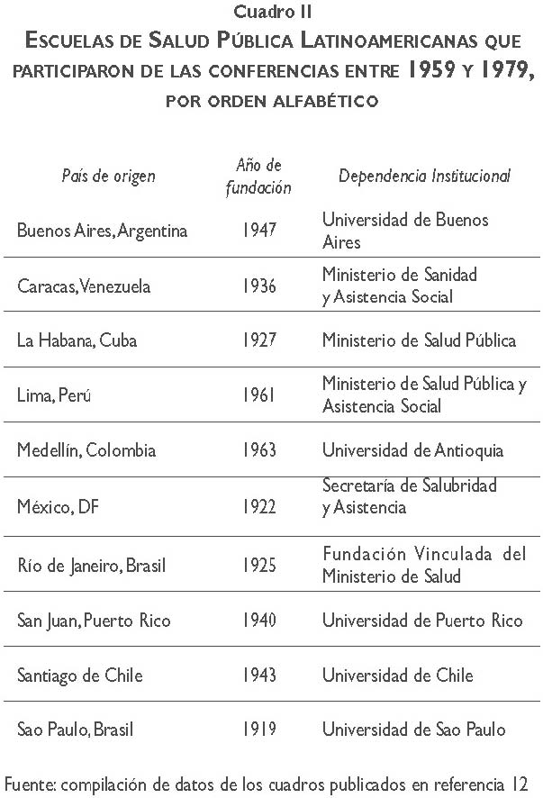 Las escuelas participantes fueron de Argentina, Brasil, Colombia, Cuba, Chile, México, Venezuela, Perú y Puerto Rico (cuadro II). Los temas discutidos cambiaron en cada reunión pero se privilegiaron los siguientes objetivos: funciones y evaluación de las escuelas de salud pública, y la enseñanza de asignaturas como bioestadística, administración pública, epidemiología y administración en la atención médica. No dejaron de lado el papel de las escuelas frente a los cambios en las condiciones socioeconómicas de América Latina y tampoco los del desarrollo de recursos humanos en salud, y la atención de la salud en el nivel primario. Finalmente, abordaron en su última reunión de 1979 el tema de la investigación aplicada a los servicios de salud.