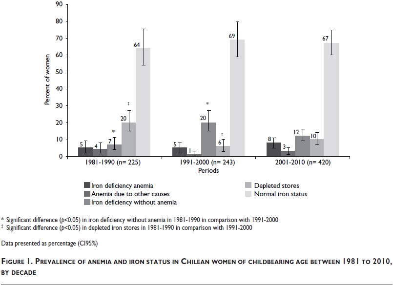 Results. Prevalence of anemia for these decades was 9, 6 and 10%, respectively (p=NS). Iron deficiency anemia was the main cause of anemia in all periods (55, 85 and 75%, respectively; p=NS). A high prevalence of women with normal iron status was observed for all periods (64, 69, and 67, respectively; p=NS). Prevalence of iron deficiency without anemia in 1981-1990, 1991-2000 and 2001-2010 was 7, 20 and 12%, respectively (p<0.05). Finally, prevalence of iron depleted stores was 20, 6 and 10%, respectively (p<0.05).